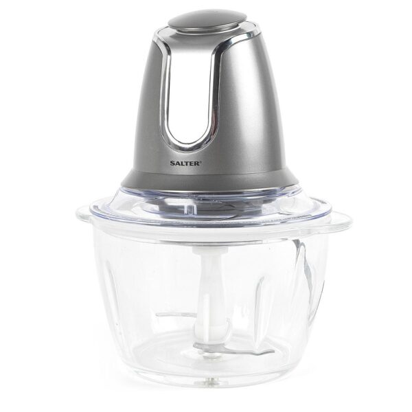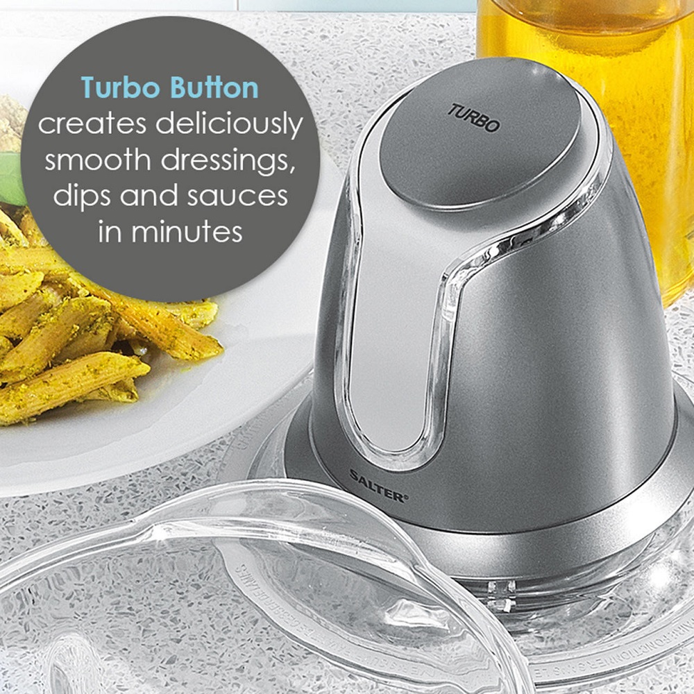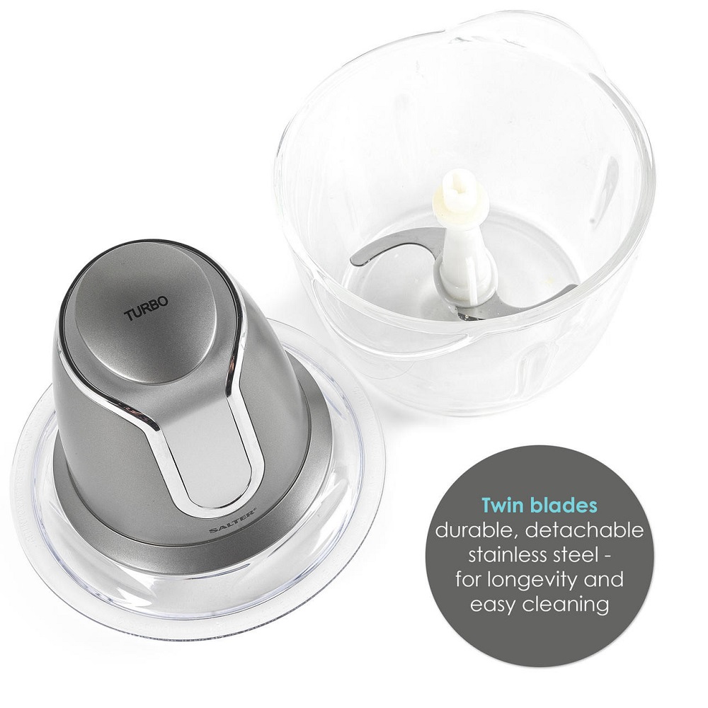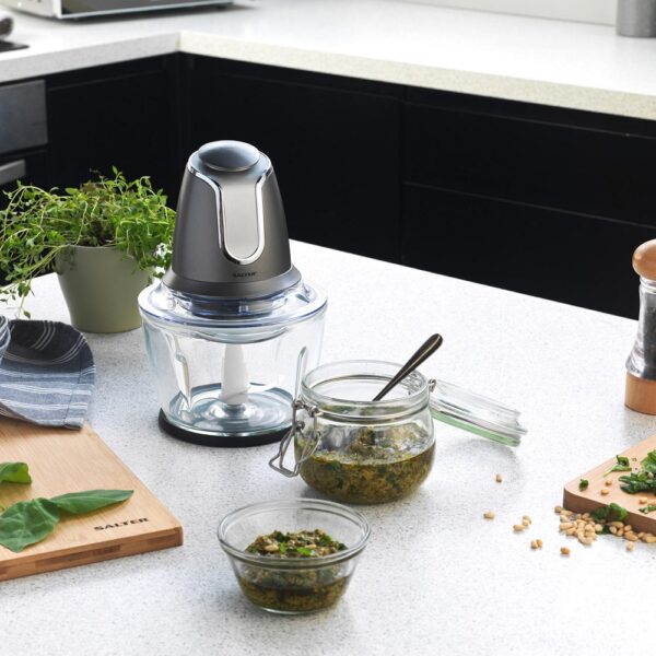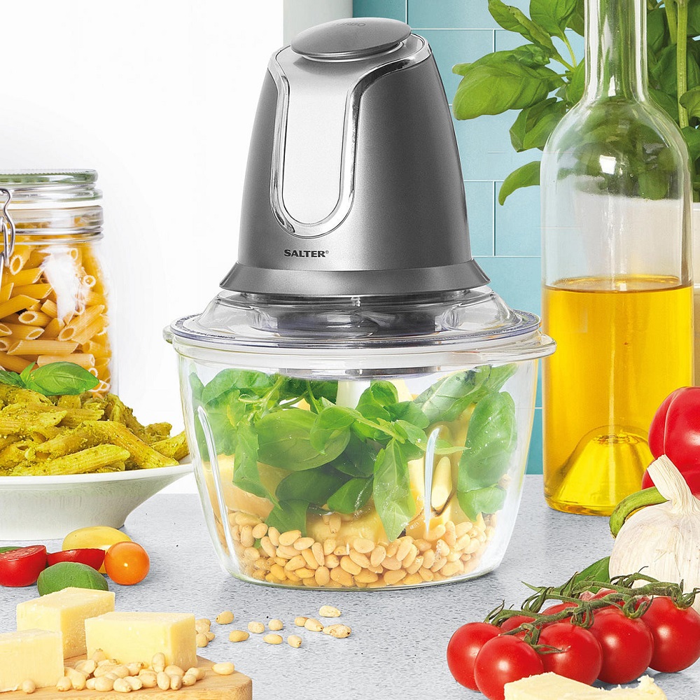 Save precious time in the kitchen with the Salter Cosmos Glass Chopper. Offering a generous 1.2 L capacity, this stylish device is perfect for preparing dressings, dips and sauces for all the family. As part of the Cosmos range, the chopper comes in a stunning gunmetal grey, which is sure to add style to any kitchen. The durable and detachable stainless steel blades teamed with a turbo button makes light of hard work, and the detachable design makes it quick and easy to clean after use.