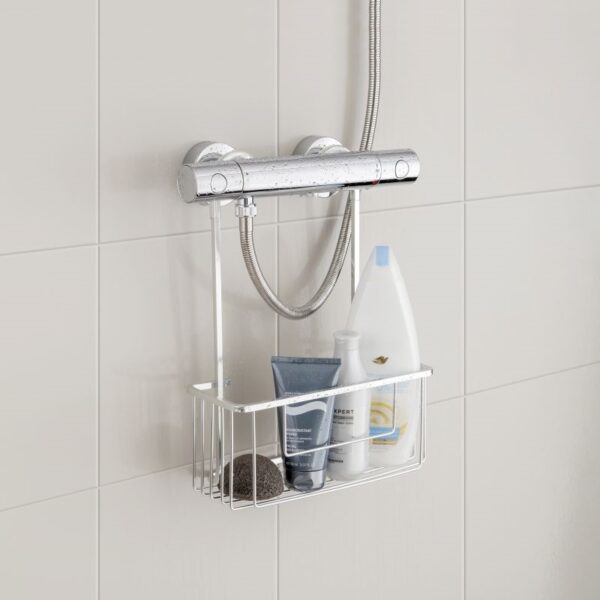 Aluminium basket with hanger made of aluminium, ideal to hang it in the two water inlets of the shower tap. It serves as a bathroom organizer for various products such as shampoos, gels, etc.