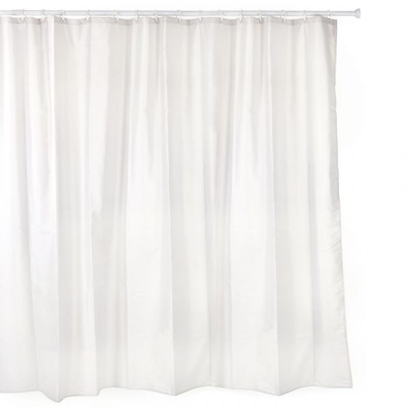 A practical shower curtain, which is distinguished by the quality of the fabric. It is water repellent and mould resistant, suitable for domestic or hospitality use. Rings included
