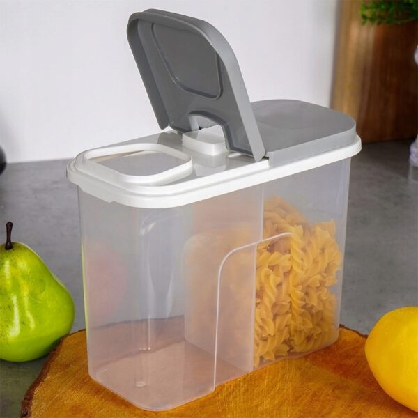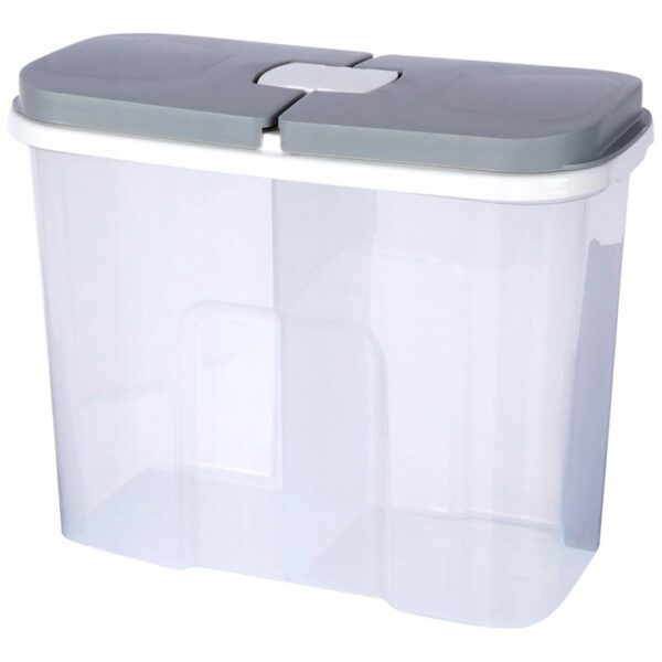 Container with two compartments with independent dispensing closure. The container is useful in every kitchen, as it allows for proper storage and of two different ingredients, introducing order and tidiness to the kitchen. A double container takes up less space than two separate containers, which will help save space. The transparent color of the container will allow you to conveniently check the contents of individual compartments without having to open them. The container is dishwasher safe. The lids protect stored products from moisture and other external factors, and also extends their freshness.
