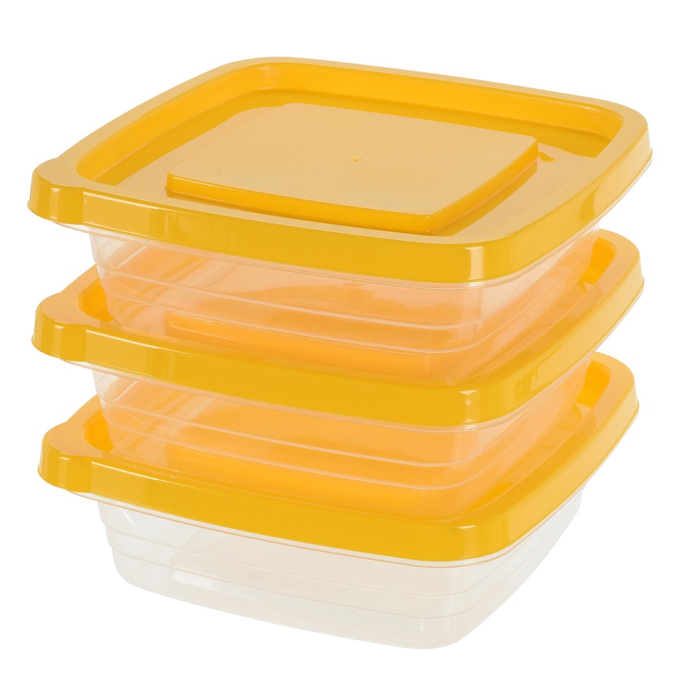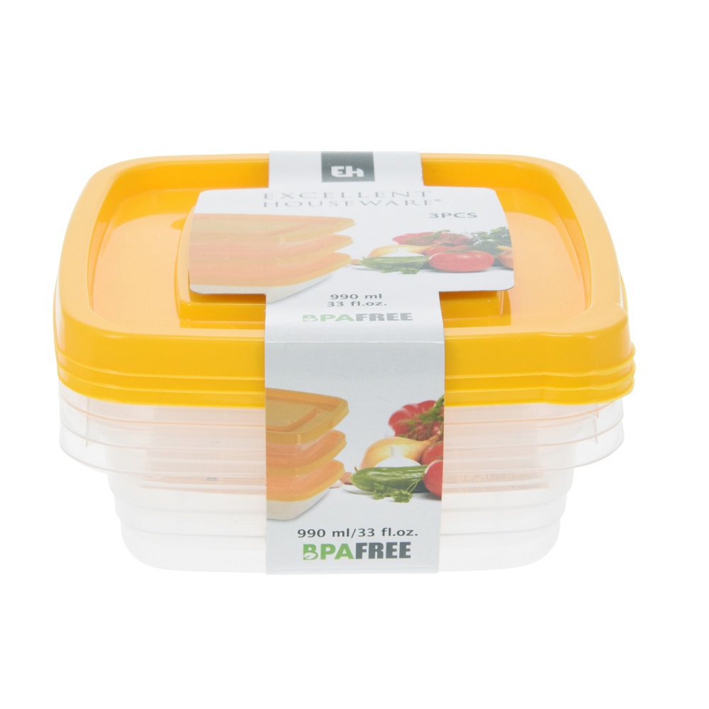 Set of 3 food storage containers made from BPA free material, which is approved for contact with food. The lids allow for stacking on top of each other. The boxes are suitable for the freezer and the microwave as well as dishwasher safe.
