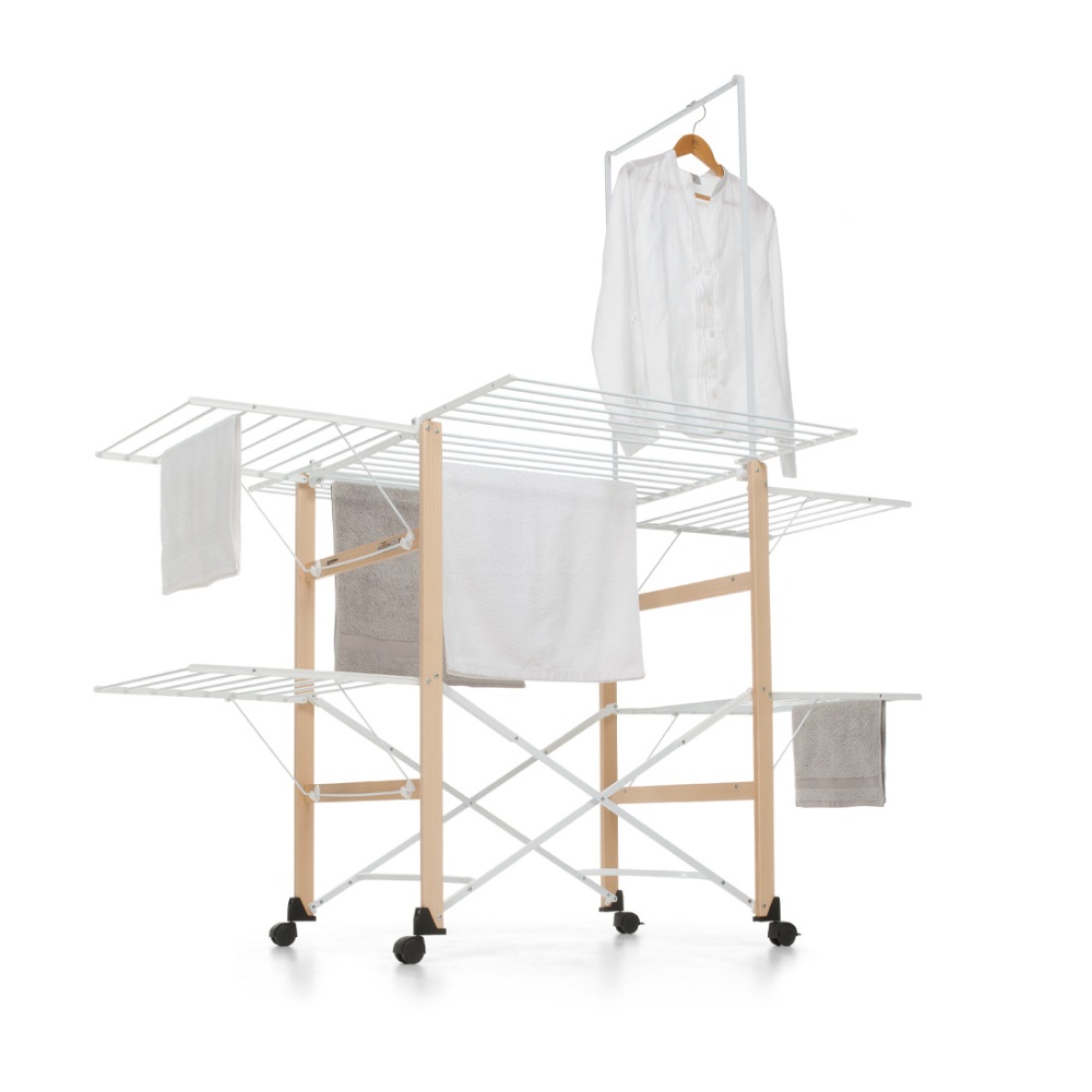 The SuperGulliver foldable clothes airer is ideal for large quantities of laundry, it offers 35 meters of useful line for drying and has a convenient shoulder bar, which easily disappears when not needed. It is very stable thanks to the solid wood structure with painted aluminium rods, but also really easy to move thanks to the 4 swivel wheels, 2 of which with brakes. SuperGulliver can be opened as needed, the lateral and front arms, are independent. And when closed, it stands alone, taking up only 14 centimetres!