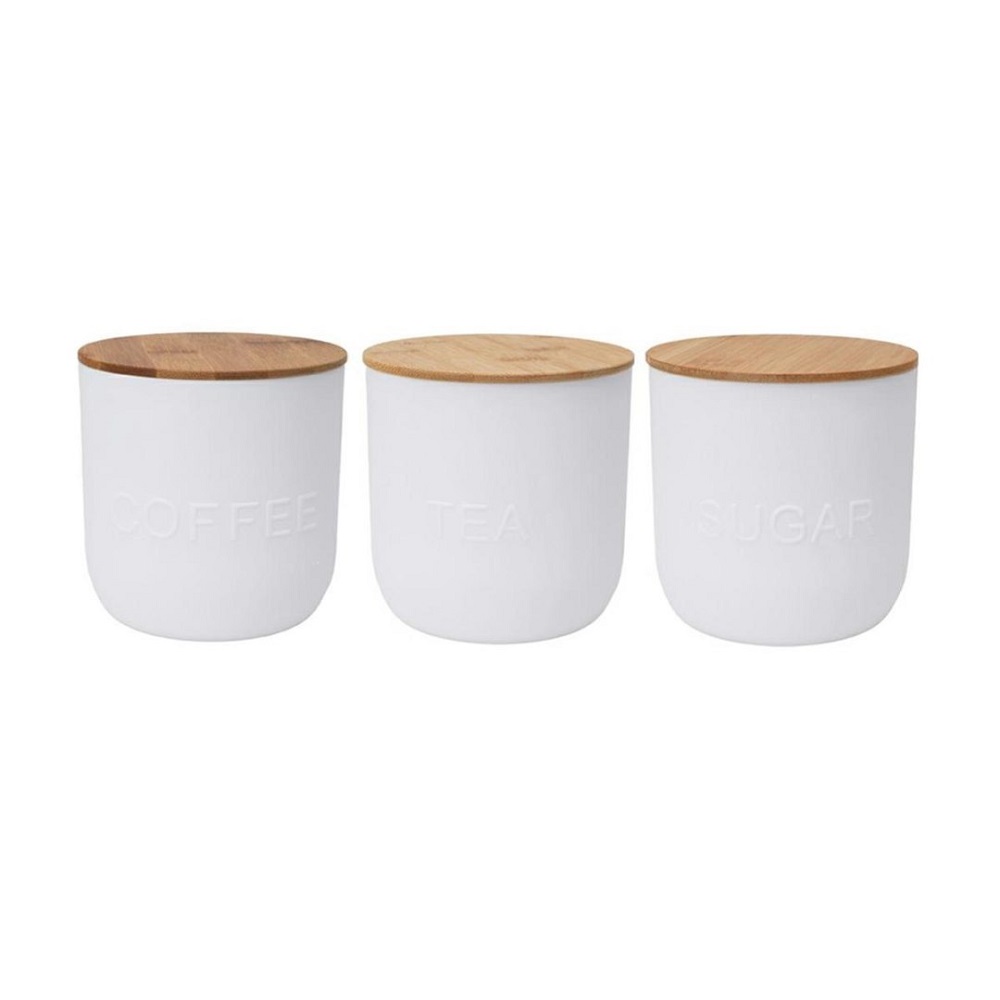 Keep your home organized with great storage solutions! These white plastic storage canisters come with a bamboo lid and raised text with the words TEA, COFFEE, SUGAR. The jars protects your ingredients from any moisture as the lids feature a silicone ring to ensure tightness.