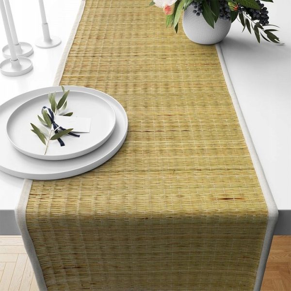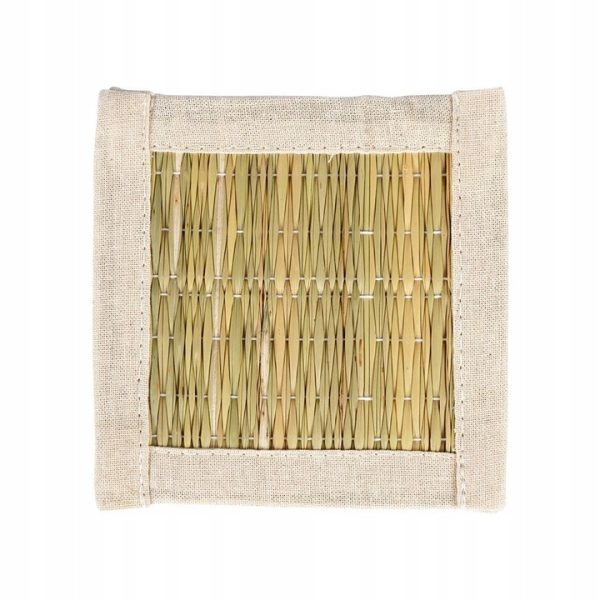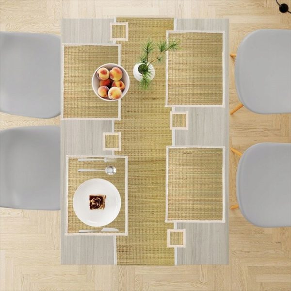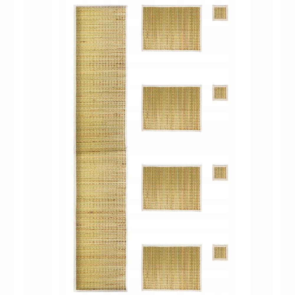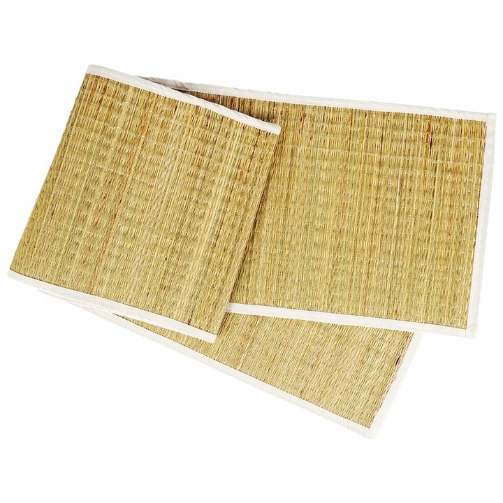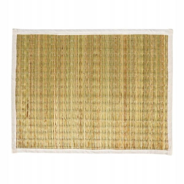 A set of four rectangular placemats together with four coasters and a table runner. The set is made of natural grass and finished with a beige cotton trim. The table set will fully protect the table top against dirt and damage and add a coherent table setting.