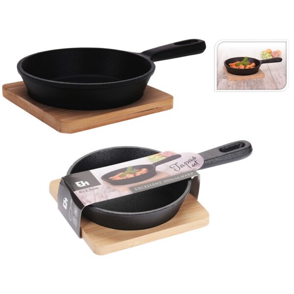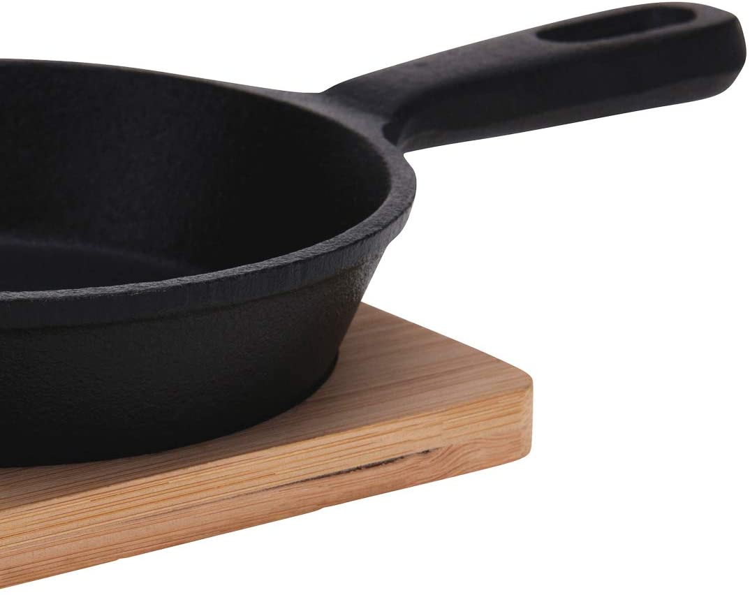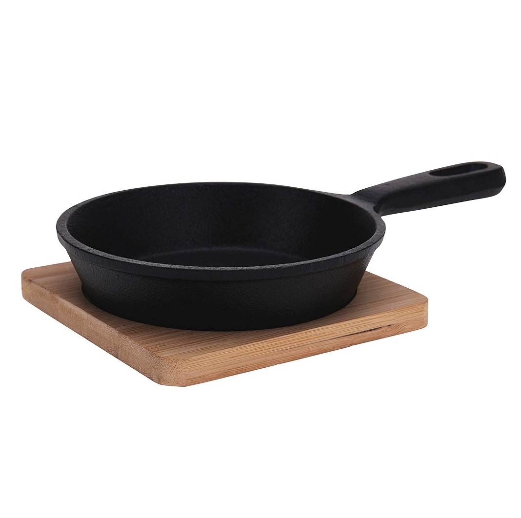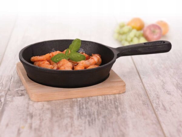 Great for side dishes, individual servings, tapas, grilling meat, vegetables and much more. Its impermeable surface can be used with acidic foods such as tomatoes and wine, and is resistant to cracking and rusting. Perfect piece to present on the table straight out of the oven or off the stove since it comes with wood grain trivet. Cast iron heat retains food hot on the table.