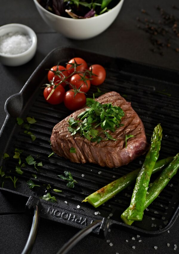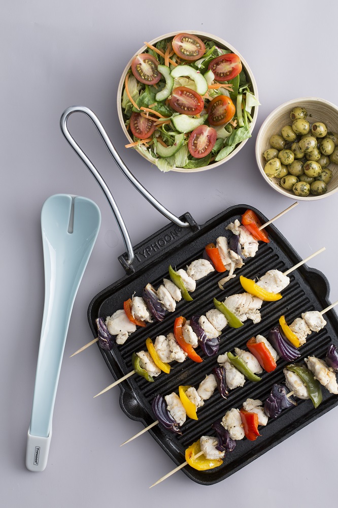 Pre-seasoned cast iron grill for fat free and healthy cooking. Handle folds for compact storage. Suitable for all hobs. Superb heat retention for energy efficient use.