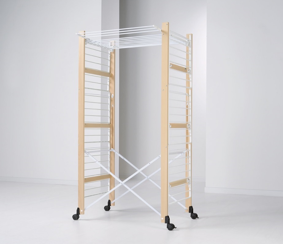 The Ursus foldable Wooden Clothes Airer by Foppapedretti is adjustable based on the amount and type of laundry to be hung. The central shelf can be positioned at two different heights: at the centre for less bulky clothes or at the top for spreading out sheets and curtains. In addition, the independent side wings can be tilted or partially opened. Ursus gives at least 33 metres of usable hanging rods, but when closed it stands on its own and takes up very little space. Ursus is also easy to move from one place to another, both when closed or when you have hanging laundry on it, thanks to the 4 scratch-proof braking castors.