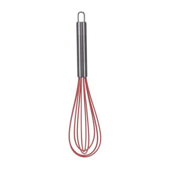 This handy silicone whisk is perfect for mixing pancake batters or whip cream. This kitchen tool has a sturdy stainless steel handle with a hanging loop making it easier to store. The whisk has flexible silicone wires, protecting your bowls from scratches. After use, it can be easily cleaned in the dishwasher.