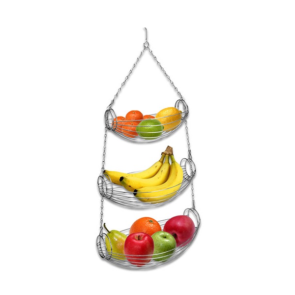 A stylish hanging basket made of chrome-plated steel with 3 levels and a hook for hanging. In this way, you can store fruit and vegetables in a chic way, and you will always have them in view and at hand. It’s oval shape offers plenty of storage space, does not take up any space and is timeless. Can also be used for plants as it withstands heavy weights.