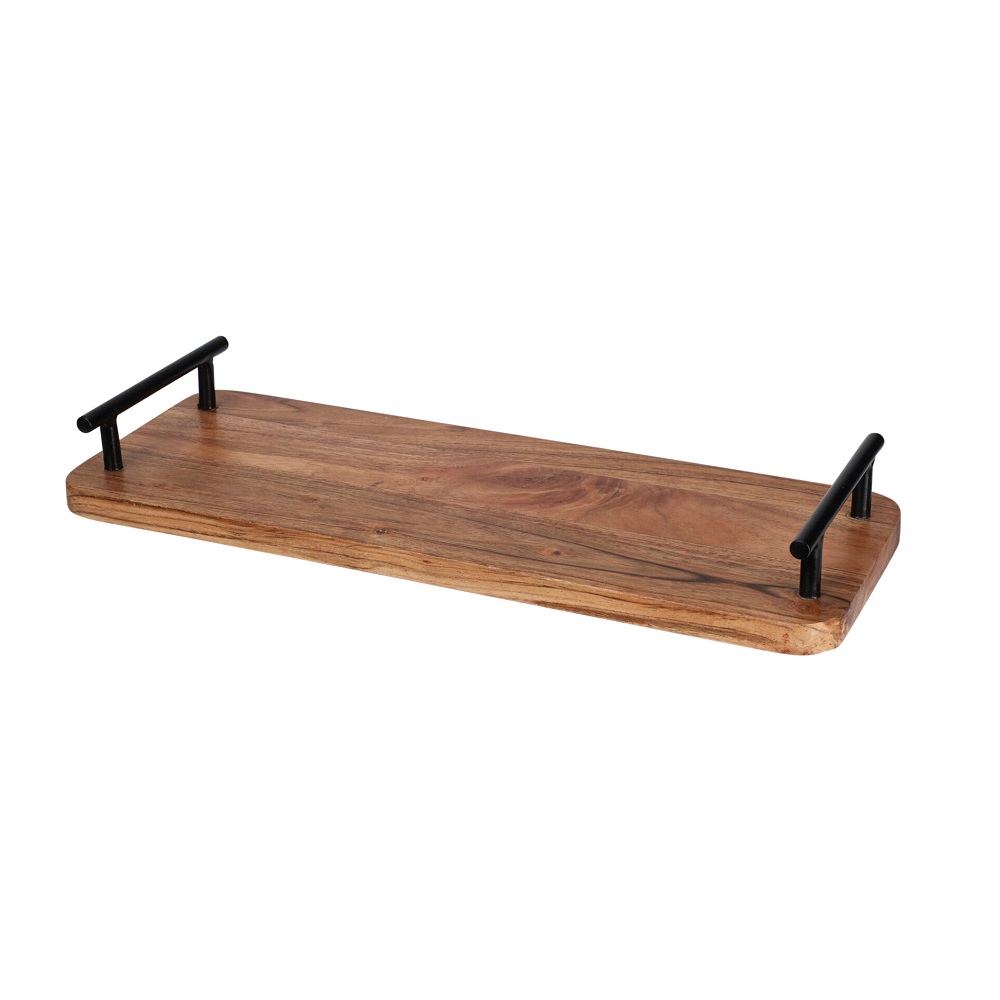 Serve your guests the tastiest snacks, coffee and desserts with this sturdy serving board, it is both decorative and functional. The tray is extremely functional thanks to its metal handles, they make it easier to bring the board to and from the kitchen. The tapas board is made of solid acacia wood. The color and size may vary slightly because it is a natural product. Not suitable for the dishwasher. It is useful for both home and restaurant use.