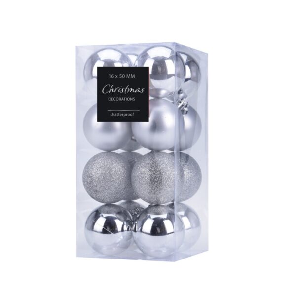 A set of 16 silver baubles in 3 patterns made of high-quality plastic, that does not break easily. The baubles are perfect for decorating Christmas trees, wreaths, centrepieces and stair or balcony garlands. Their shimmer and glitter will reflect beautifully in the light of the twinkling Christmas tree.
