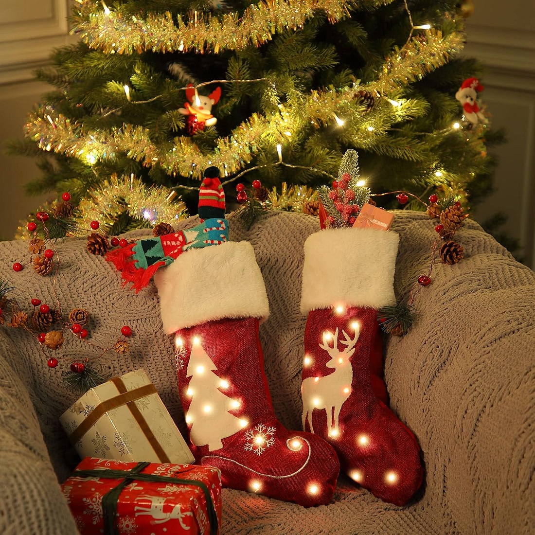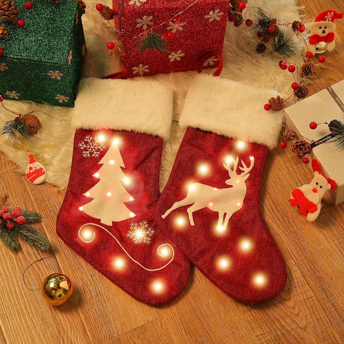 This cute classic stocking features LED beads sewn into it which is easily lit up by installing batteries. The luminous Christmas stockings are even more beautiful at night. Two models to choose from; one featuring a Christmas Tree with Snowflakes, or a cute Reindeer design. The white faux fur and red jute sock complement each other beautifully.